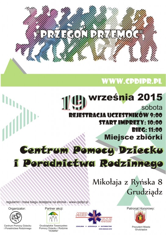 Bieg pn. „Przegoń Przemoc” to propozycja Centrum Pomocy Dziecku i Poradnictwa Rodzinnego oraz Towarzystwa Pomocy Dziecku i Rodzinie „Homini” na integrację instytucji oraz osób działających na rzecz krzywdzonych dzieci. Wydarzenie zaplanowano w sobotę, 19 września.